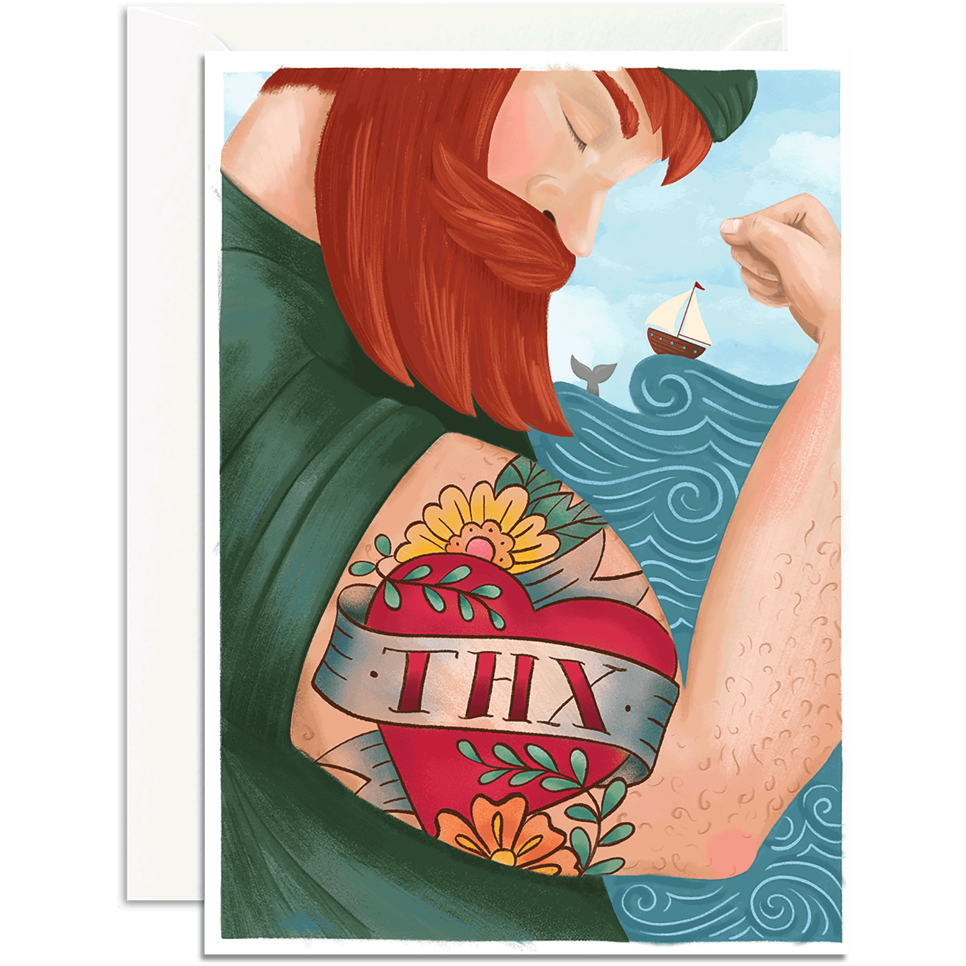 Say thanks with serious muscle. This nautical-inspired card features a strongman with a classic tattoo heart that proudly declares 'THX,' perfect for sending gratitude with a punch of personality.